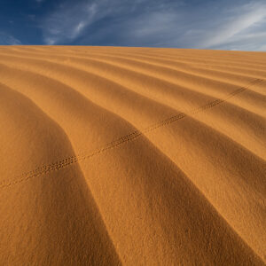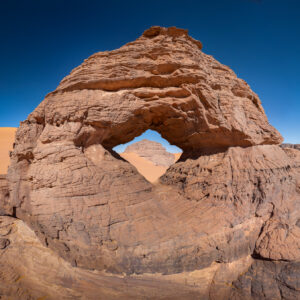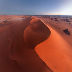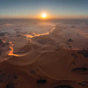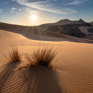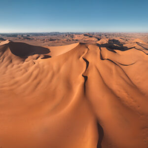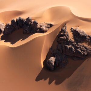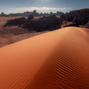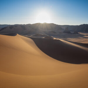 As our caravan cuts thru the raw lands of Algeria, the desert reveals itself in layers of color and form. The most remote region where our caravan will pass, for instance, impresses with its intense reddish sand, where warm tones dominate the view and create an almost Martian setting. Giant and expansive dunes, found in this region, further enhance the feeling of being in a parallel universe: from the top, the panoramic view reveals the silent and mesmerizing vastness of the Sahara, a landscape where there is no urban presence — only nature in its purest form.