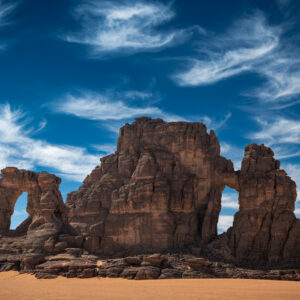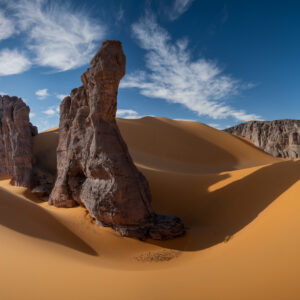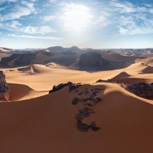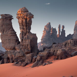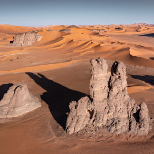 The expedition to the Algerian Sahara offers a completely unusual visual experience, taking travelers through landscapes that seem to have come from another planet. Tassili N’Ajjer National Park is known by the diversity of desertic landscape elements: orange dunes, vast valleys, black stone columns and solitary acacia trees make up scenes of raw and breathtaking beauty.